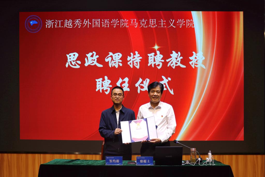 论坛伊始,马克思主义学院院长赵海峰向枫源村进行“思政课社会实践基地”授牌,并向骆根土书记颁发了思政课特聘教授聘书。骆根土书记既是“枫桥经验”的专家学者更是一位基层治理的践行者,在推动思政课走进枫源村的过程中发挥了重要作用。他不仅分享了枫源村在基层治理中的先进经验,还积极支持学院开展思政教育实践活动,为学生们提供了生动鲜活的实践案例。