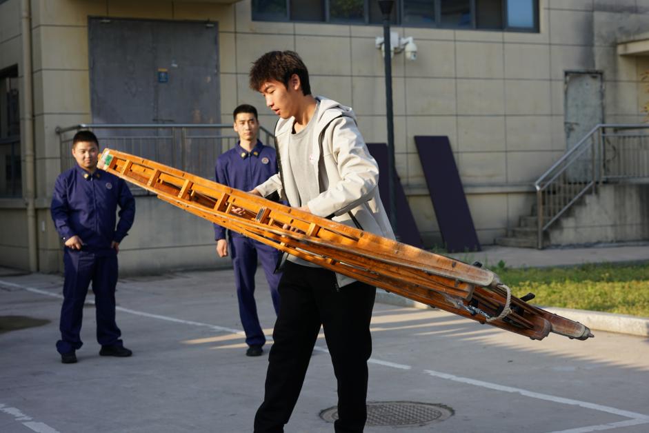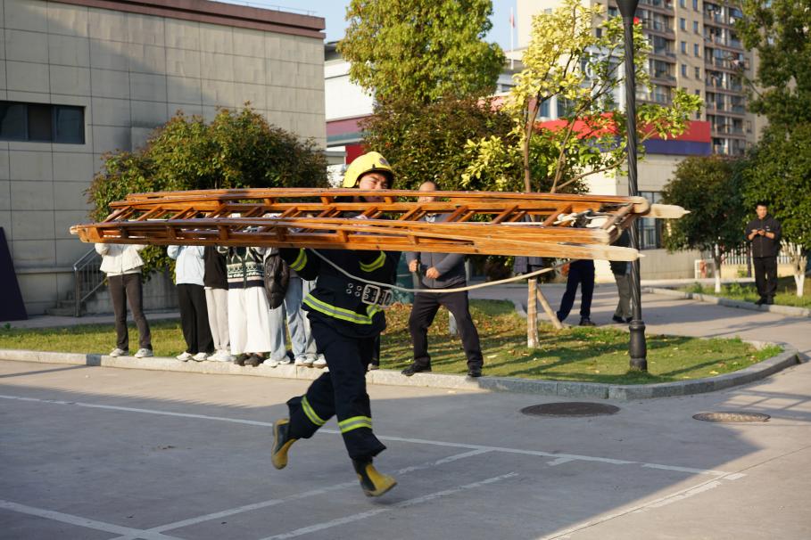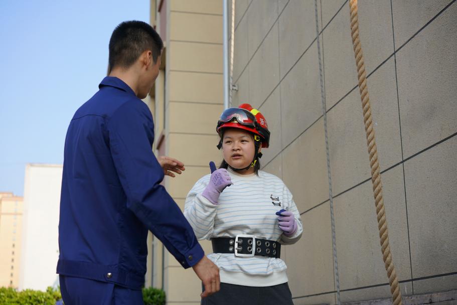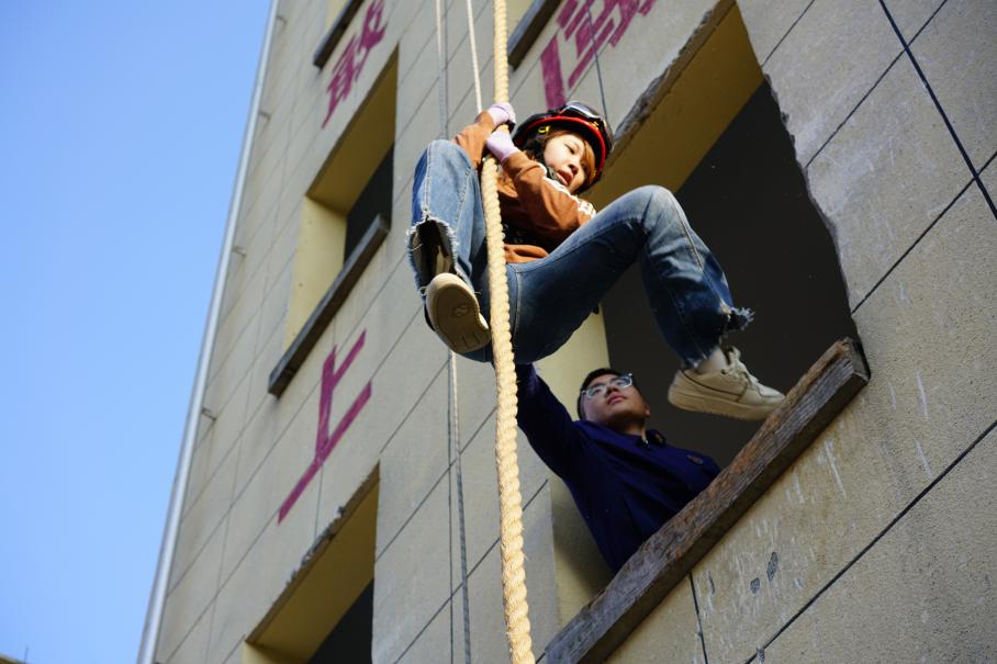 (同学穿戴消防安全装备进行爬楼训练)