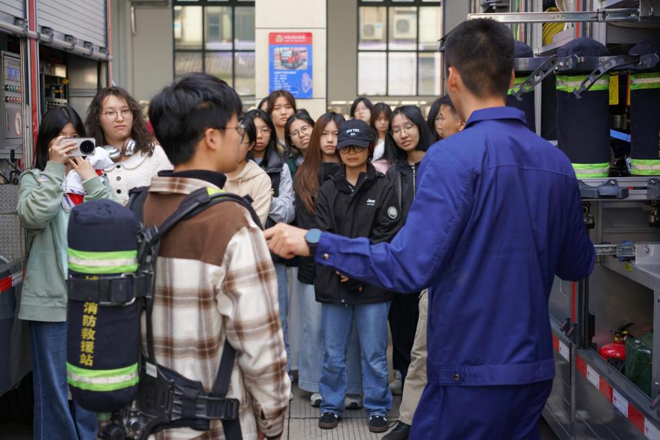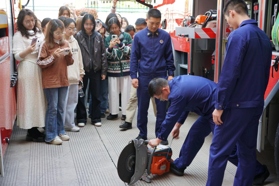 抵达消防救援站后,在站点消防员的热情引导下,同学们首先参观了消防车辆装备区。消防战士黄班长围绕消防车功能分类、随车装备配置及实际应用场景等进行了系统讲解,并现场展示了破拆器材、防护装备及灭火救援器械的使用方法。通过直观生动的讲解与演示,同学们深刻认识到现代消防救援工作的专业性与技术性,对消防队伍“对党忠诚、纪律严明、赴汤蹈火、竭诚为民”的职责使命有了更加直观深入的理解。