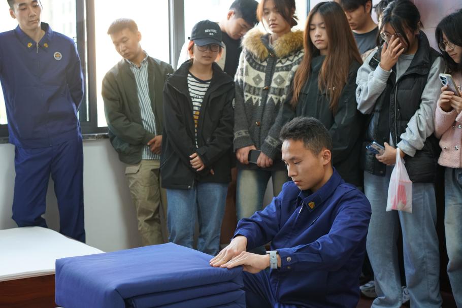 随后,同学们走进消防员生活训练区域,参观了值班室、学习室、宿舍及体能训练场地,全面了解消防救援队伍日常执勤训练和生活管理情况。整齐规范的内务环境、严格有序的管理制度以及紧张高效的训练节奏,充分展现了消防救援队伍严明的纪律作风和过硬的职业素养,使同学们深受触动与启发。