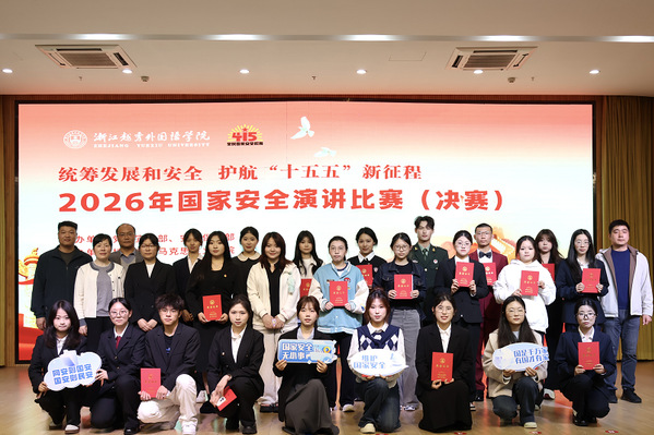 4月14日下午,我校镜湖校区越秀厅内气氛热烈。为深入学习宣传贯彻总体国家安全观,切实增强青年一代的国家安全意识和素养,浙江越秀外国语学院2026年“国家安全记心间 知行合一筑防线”主题演讲比赛决赛在此举行。此次活动不仅是马克思主义学院“感知浙江”系列实践教学活动的深化拓展,也是学校“4·15”全民国家安全教育日主题系列活动的重头戏之一,旨在以青春之声讲述国安故事,将思政小课堂与社会大课堂紧密贯通,筑牢维护国家安全的思想长城。