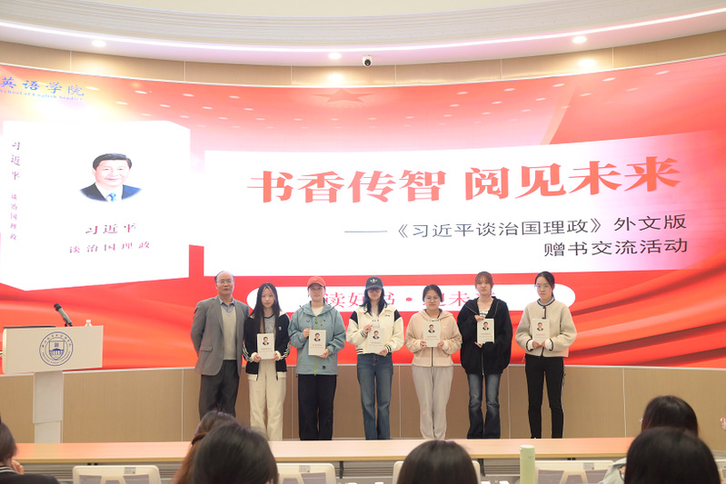 讲座结束后,举行了简短的赠书仪式。马克思主义学院副院长史丽琴代表学院,与卢传斌副教授一同向学生代表赠送了《习近平谈治国理政》第五卷英文版图书。史丽琴指出,在“世界读书日”来临之际赠送该著作英文版,既是深化对习近平总书记治国理政思想学习的重要举措,也是结合英语学科特点、推动理论国际传播的积极尝试,有助于师生在跨文化语境中深化对当代中国马克思主义的理解。