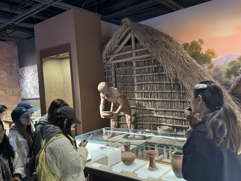 讲解员带着师生们步入酒史厅,酒史厅以时间为线索,配合文字展板、实物陈列与立体场景,系统展示了黄酒从远古起源到明清时期的发展演变历程,将黄酒数千年的发展脉络清晰呈现。重点展示了河姆渡遗址出土的稻谷堆积层、“空桑偶得”的传说以及历代酒器等内容,生动再现了黄酒作为世界三大古酒之一的悠久历史。