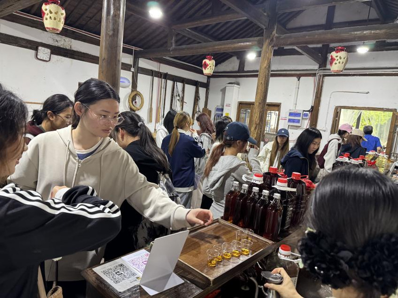 酒俗厅展现了黄酒浸润越地百姓生活的深厚底蕴。学生们深刻理解了酒在婚嫁、寿宴、节令中承载的情感寄托与文化意涵。酒业厅主要展示了中国黄酒产业的发展概况及黄酒的科学知识。展厅内陈列了全国各地的代表性黄酒产品,介绍了黄酒的分类、营养成分、品鉴方法及养生功效。在黄酒体验中心,学生们近距离观察黄酒的酿造器具、酒坛文化,并与现场工作人员交流互动,深入了解黄酒的品鉴知识与民俗文化,沉浸式感受黄酒文化的深厚底蕴。