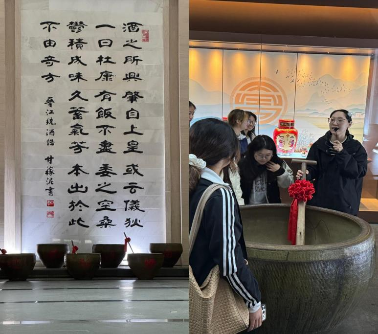 在讲解员的引导下,师生们依次参观了序厅、酒史厅、酒俗厅、酒业厅等核心展区,对黄酒文化进行了系统学习。在序厅,师生们了解了黄酒的起源传说与基本发展脉络。