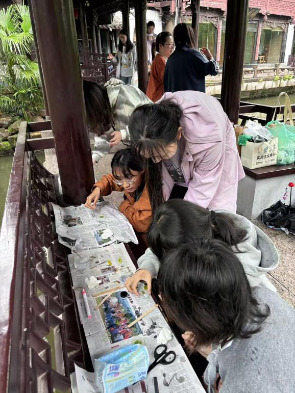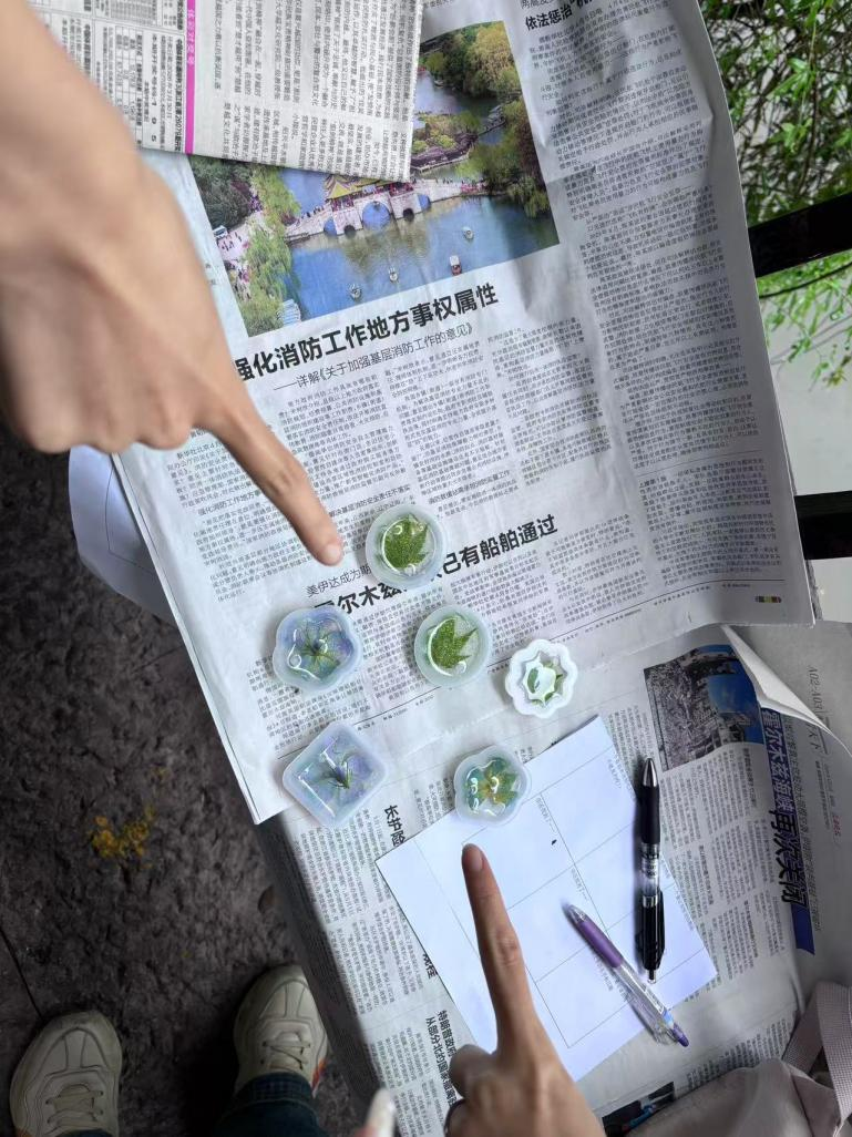探索与记录完成后,学们进入滴胶手工制作环节。大家将在园中收集到的心仪自然小物轻轻放入滴胶模具,分层浇灌胶水,把雨中鹿湖园的生机与春日美好一一封存。专注创作的过程里,同学们沉浸当下、舒缓心绪,将自然赋予的宁静与力量,化作一枚枚专属的春日纪念挂件,让自然之美长久留存。