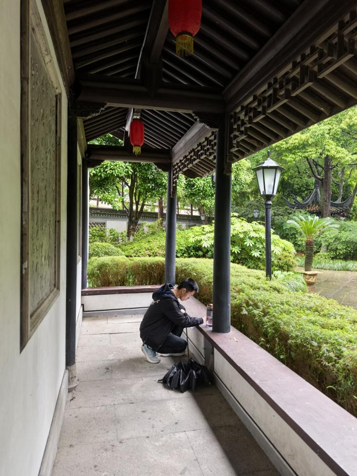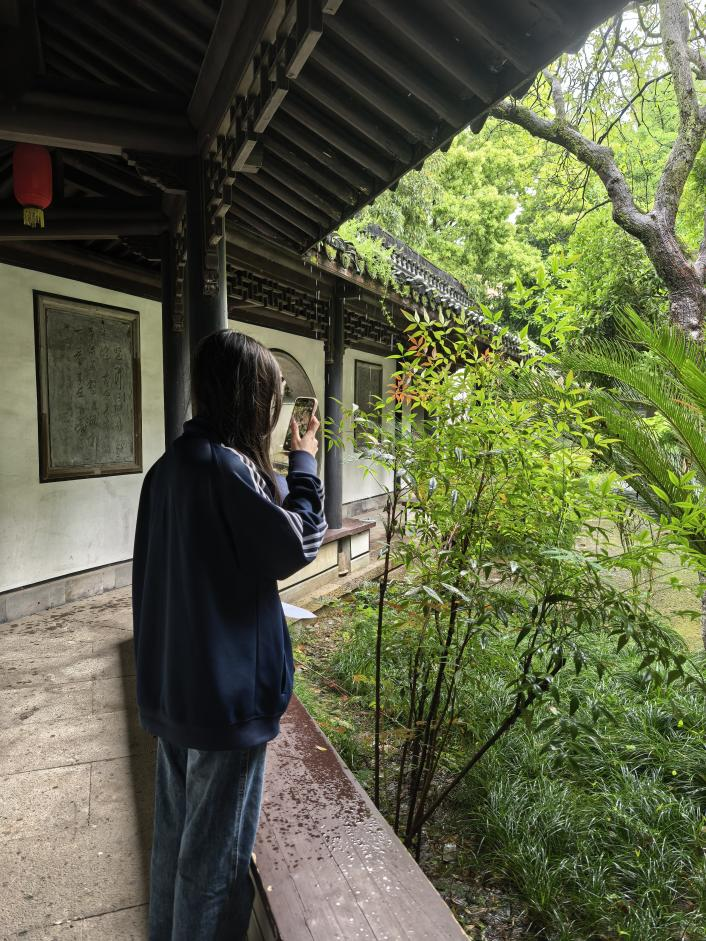 活动伊始,在老师的轻柔引导下,同学们静坐于湖面连廊,暂别学业与生活的纷扰,进入冥想状态,专注激活视觉、听觉、触觉、嗅觉与味觉。淅沥的雨声、清脆的鸟鸣、微风拂过枝叶的窸窣……自然之声化作唤醒身心的音符。同学们细致观察着石上的青苔、墙面的蜗牛、屋檐滴落的雨珠在水面漾开的涟漪,甚至捕捉到远处猫咪的轻叫。在细微之处的发现中,大家逐渐从浮躁回归宁静,完成了与自然的第一次对话。